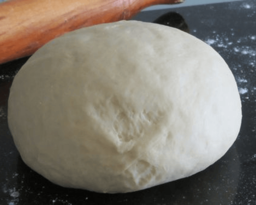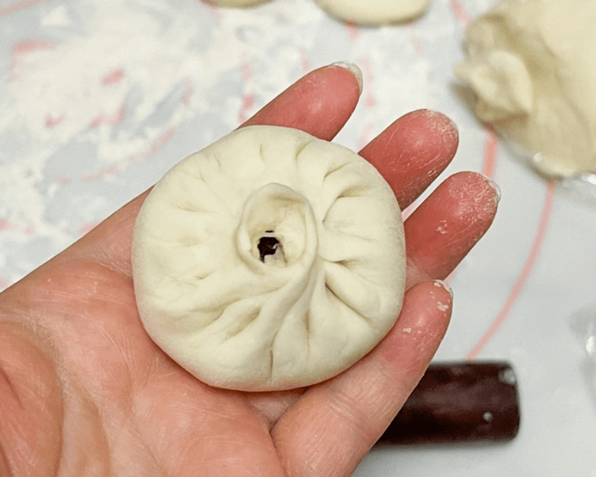 - Chia bột thành 6–8 phần, cán mỏng, cho nhân vào giữa, gói kín miệng.