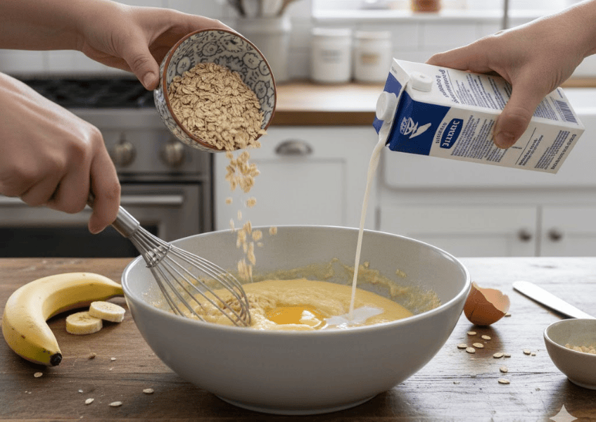 • Cho yến mạch, trứng, sữa và bột quế vào tô chuối.