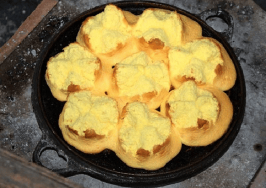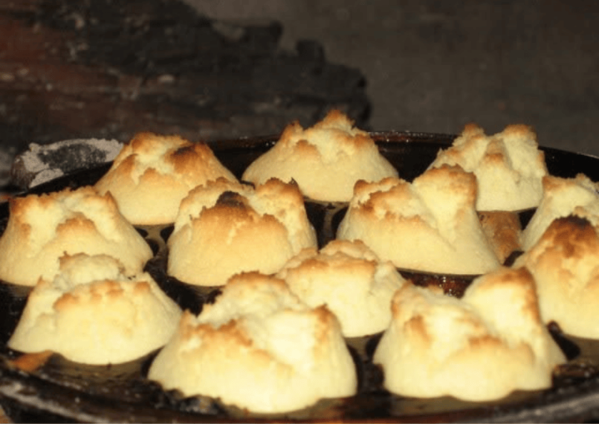 - Đậy nắp khuôn và nướng trong khoảng 10−15 phút. Nếu nướng than, cần có lửa trên và lửa dưới. Bánh chín sẽ nở bung đẹp mắt và có màu vàng óng.