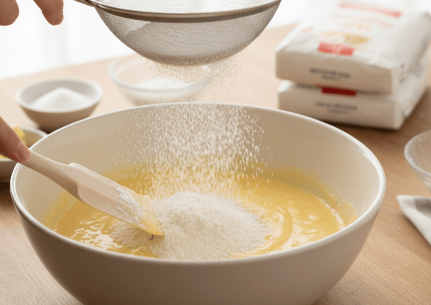- Rây từ từ bột mì vào hỗn hợp trứng. Dùng kỹ thuật trộn nhẹ nhàng, dứt khoát từ dưới lên để bột hòa quyện mà không làm vỡ bọt khí trứng. Thêm vani/chanh và nước cốt dừa.