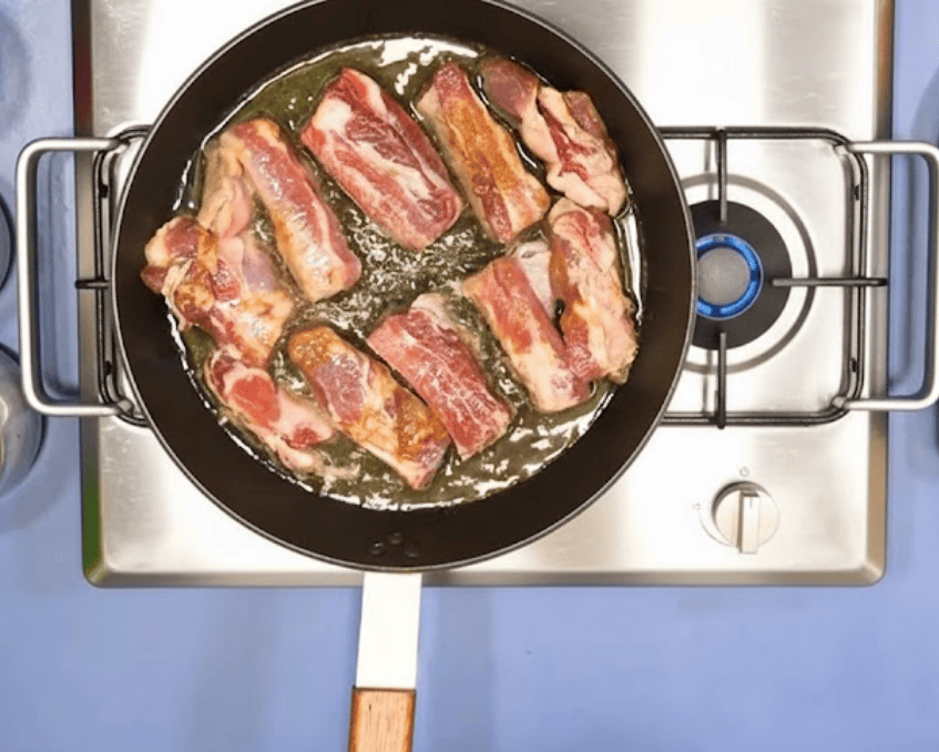 • Làm nóng dầu ăn trên chảo, cho sườn vào chiên trên lửa vừa.