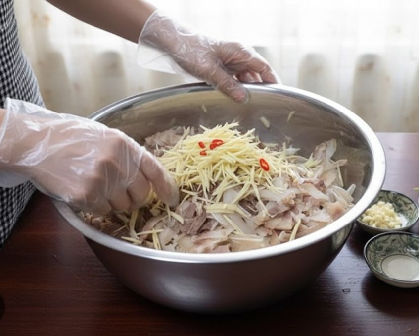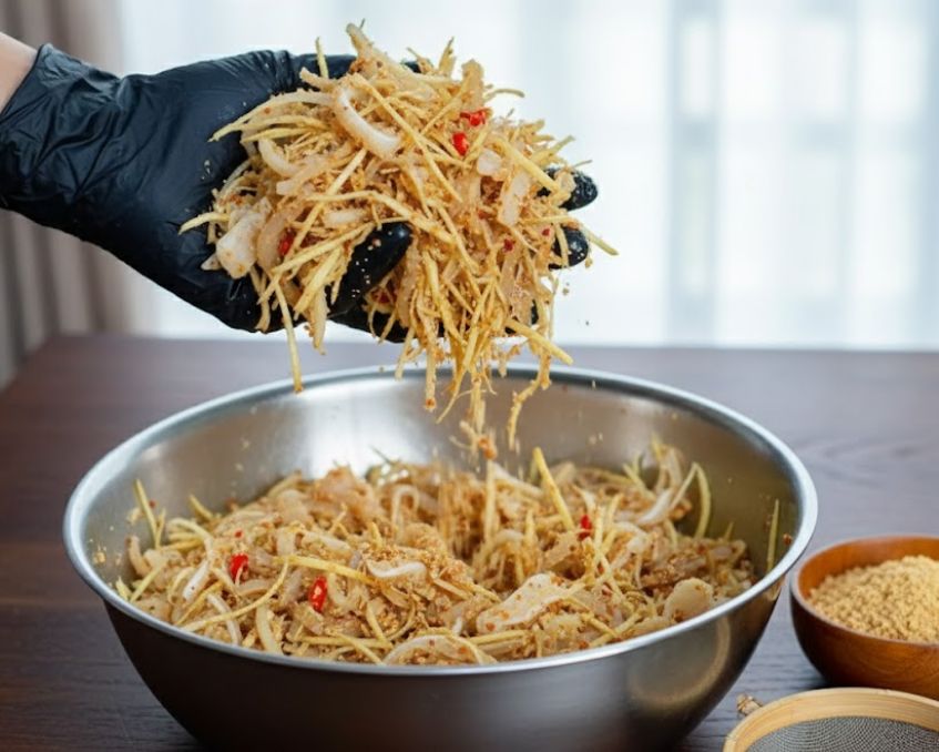 - Rắc thính từ từ, trộn đến khi thịt áo đều thính và ráo (không bị bột vón).