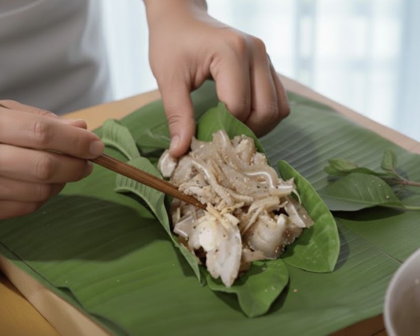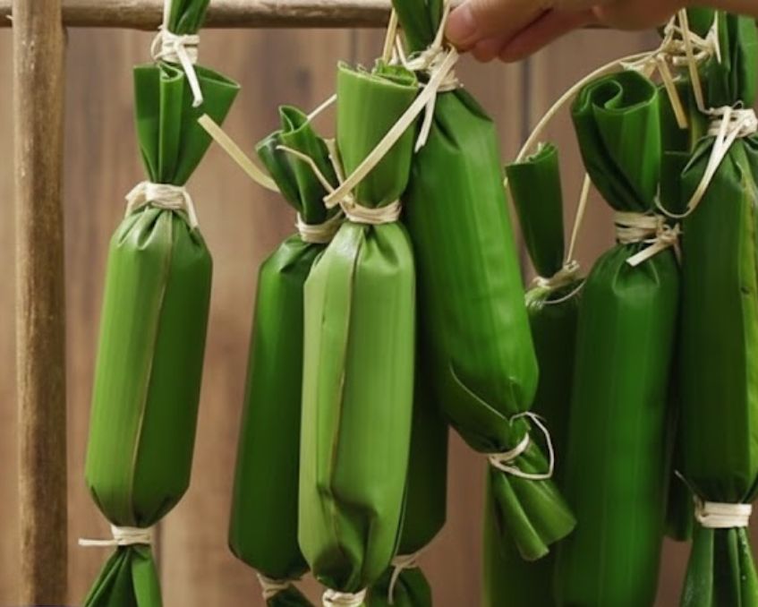 - Cuốn thành đòn nhỏ hoặc gói hình tam giác/thuôn (tùy thói quen vùng), buộc thật chặt để lên men đều.