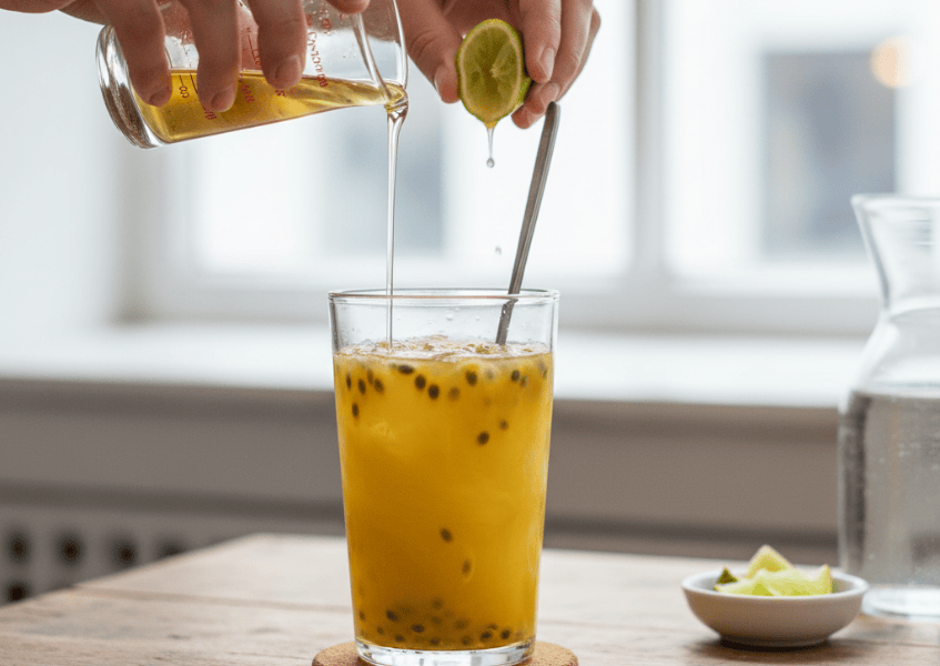 - Cho nước cốt chanh dây, syrup đường (20 ml), và nước cốt chanh tươi (5 ml) vào ly.