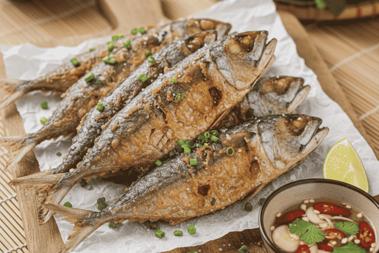 • Chiên mỗi mặt khoảng 5–7 phút, hoặc cho đến khi cá chín vàng đều và lớp da giòn rụm. Gắp cá ra, đặt lên giấy thấm dầu để loại bỏ dầu thừa.