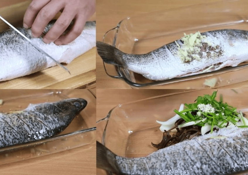 • Cá chẽm phi lê rửa sạch, thấm khô. Ướp cá với nước mắm (15 ml), dầu hào (10 ml), tiêu xay (3 g), gừng thái sợi (10 g) và sả băm (10 g) trong 15 phút.
