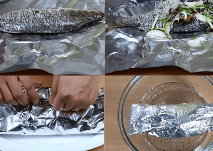 • Lấy gói cá ra khỏi lò, đặt nguyên gói lên đĩa. Mở nhẹ nhàng lớp giấy bạc để hơi nóng và hương thơm lan tỏa.