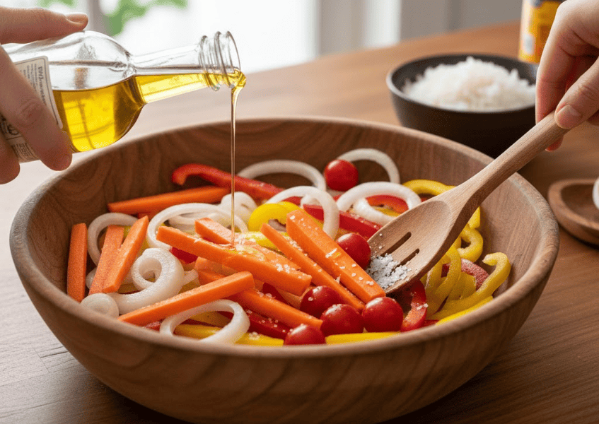 • Cà rốt (100 g), hành tây (50 g), ớt chuông (50 g), cà chua bi (50 g) trộn đều với một chút dầu ăn (5 ml) và muối (2 g).