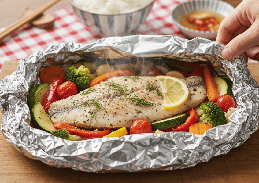 • Cho gói cá vào nướng trong khoảng 20–25 phút. Cá và rau củ sẽ chín mềm và mọng nước.