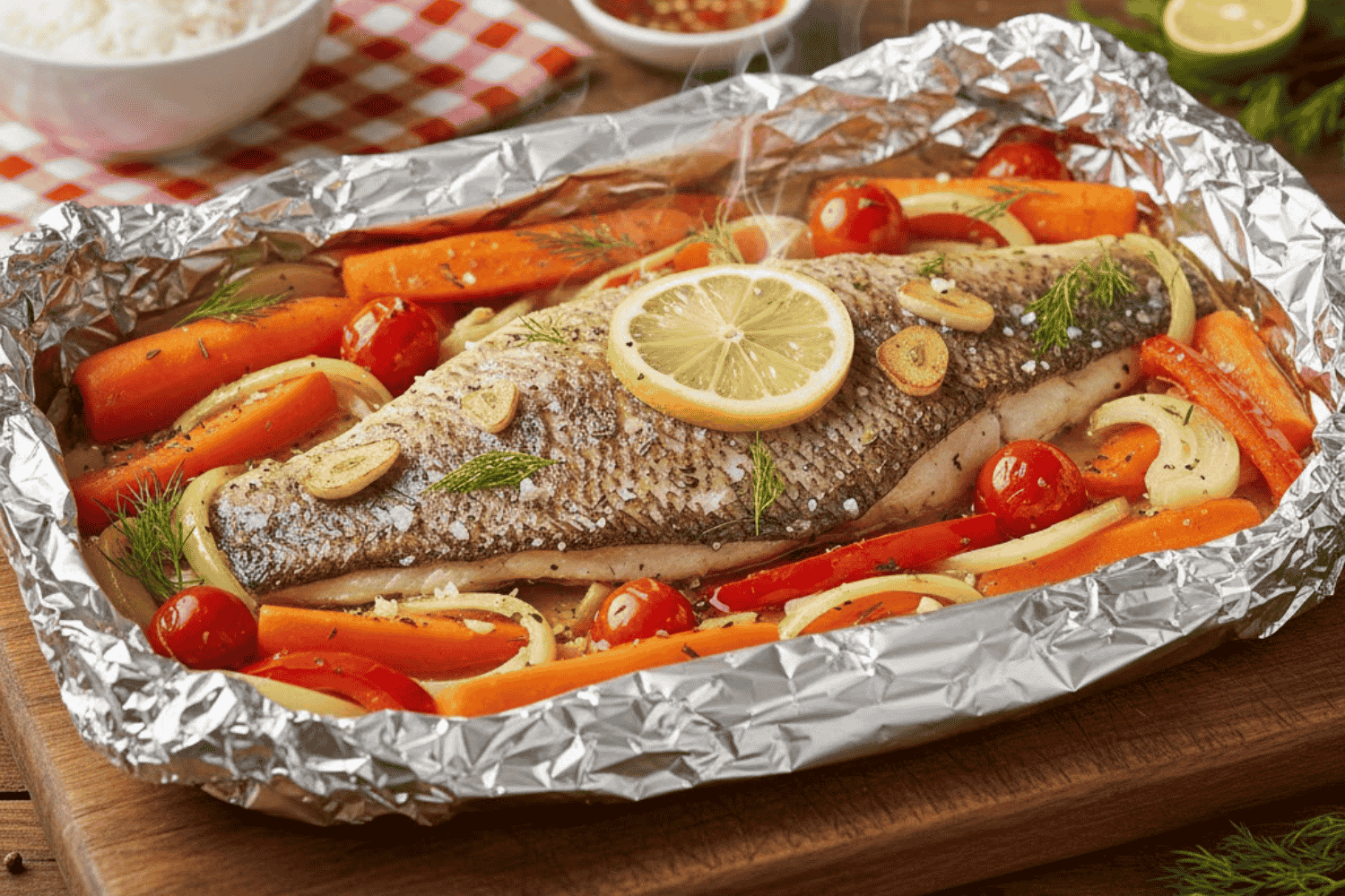 Cá chẽm nướng giấy bạc rau củ mềm ngọt, giữ trọn vị ngon