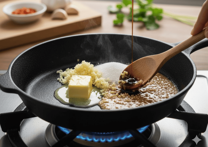 - Cho nước tương (15 ml), đường (10 g) và nước lọc (30 ml) vào, khuấy đều. Nấu sốt khoảng 1 phút cho sốt sánh lại.