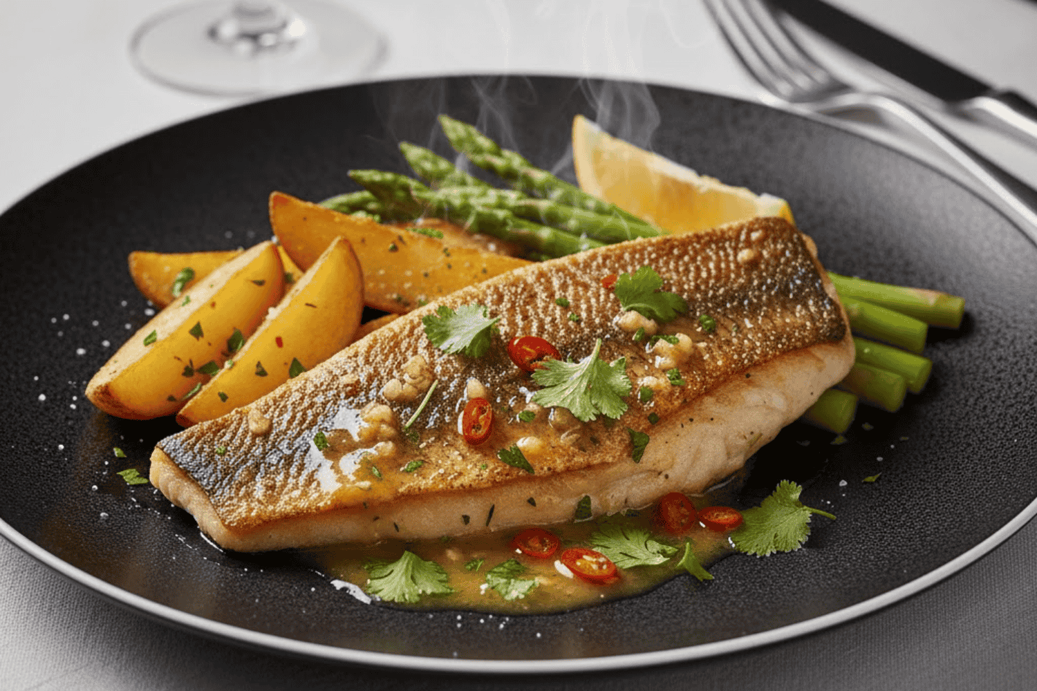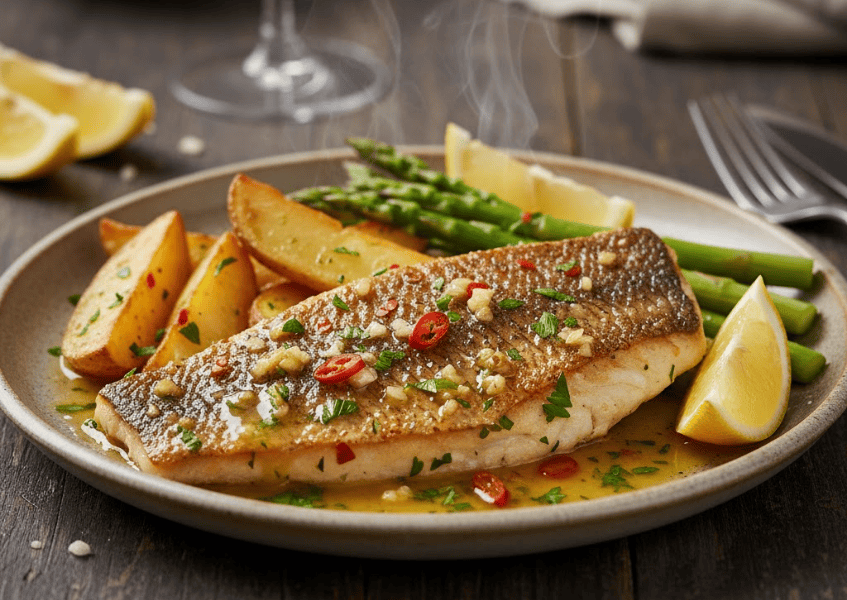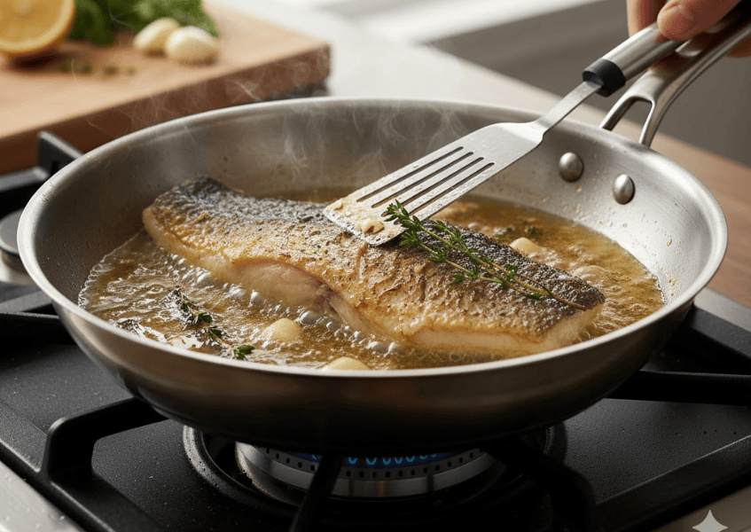 - Cách chế biến: Bí quyết nằm ở kỹ thuật chiên cá chẽm ngập dầu hoặc áp chảo nhanh để lớp ngoài giòn, sau đó sử dụng chính chảo đó để làm sốt bơ tỏi rưới lên. Cần kiểm soát nhiệt độ để tỏi phi thơm mà không bị cháy.