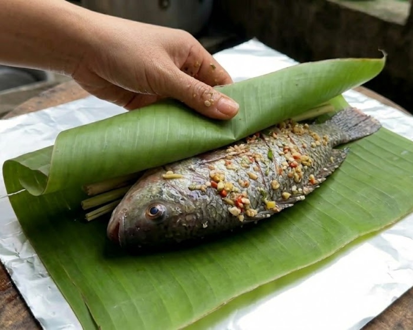 - Gói cá kín lại bằng lá chuối rồi gói thêm lớp giấy bạc bên ngoài để giữ ẩm và tránh tràn nước sốt khi nướng.