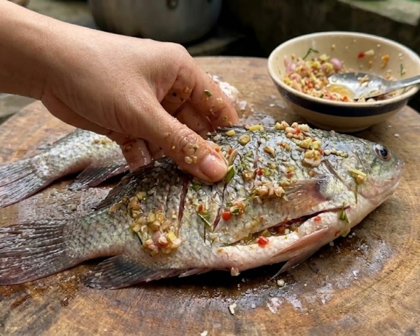 - Xoa đều hỗn hợp gia vị này lên cá, trong và ngoài bụng cá.