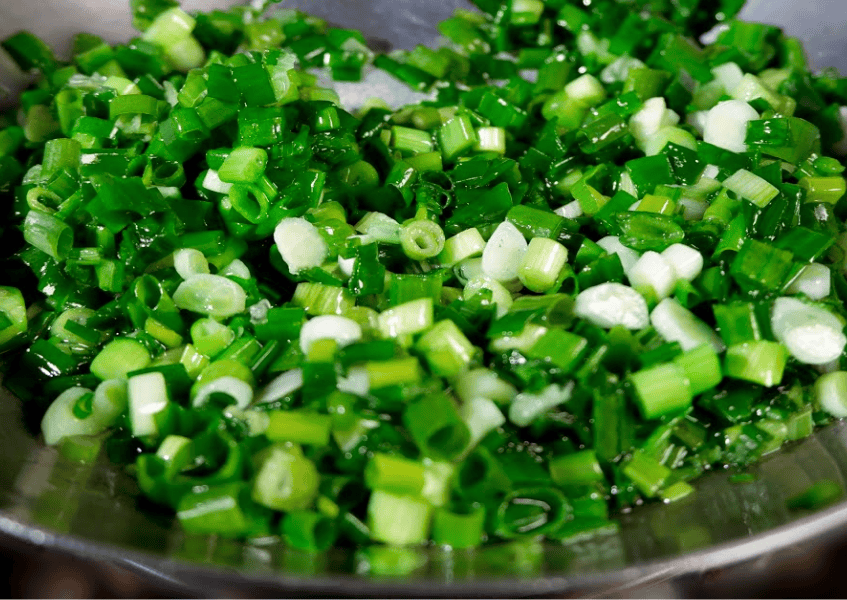 - Đun nóng dầu ăn, rưới lên hành để hành chín và dậy mùi thơm béo ngậy.