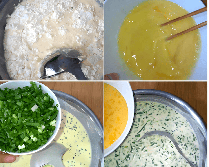 - Thêm hành lá cắt nhỏ vào hỗn hợp bột.