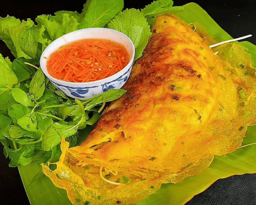- Cách trình bày và thưởng thức: Bánh được gập đôi hình bán nguyệt, màu vàng nghệ đẹp mắt, lộ ra phần nhân mực và giá đỗ bên trong. Ăn đúng điệu là phải dùng tay cuốn bánh cùng rau xanh.