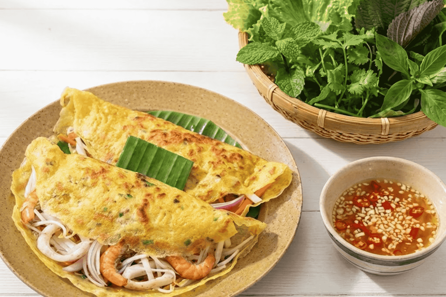 - Rau ăn kèm: Bánh xèo miền Trung ngon nhất khi ăn kèm cải bẹ xanh (cải cay), xà lách và các loại rau thơm như húng quế, diếp cá.