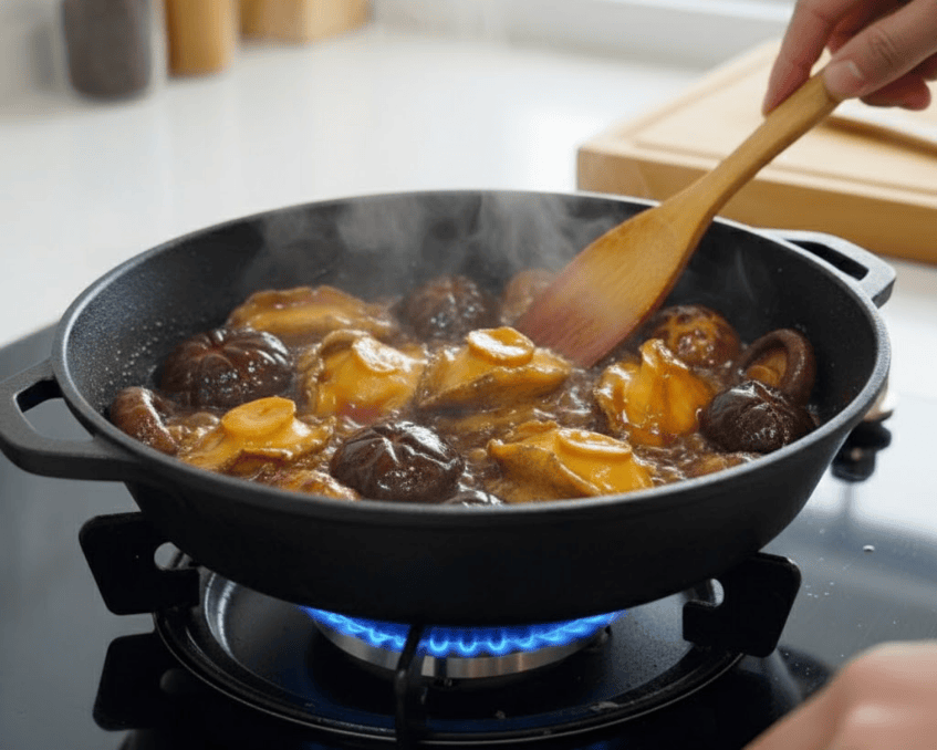 - Đun sôi nhỏ lửa 5–7 phút cho nấm thấm vị và nước sốt sệt lại.