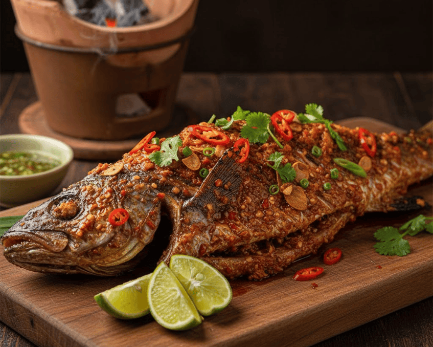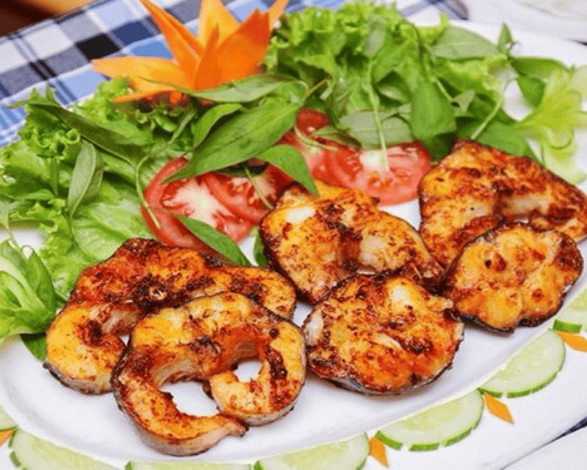 - Cách trình bày và thưởng thức: Cá sau khi nướng được chặt miếng vừa ăn. Rắc thêm hành phi, tiêu xay và rau thơm.
