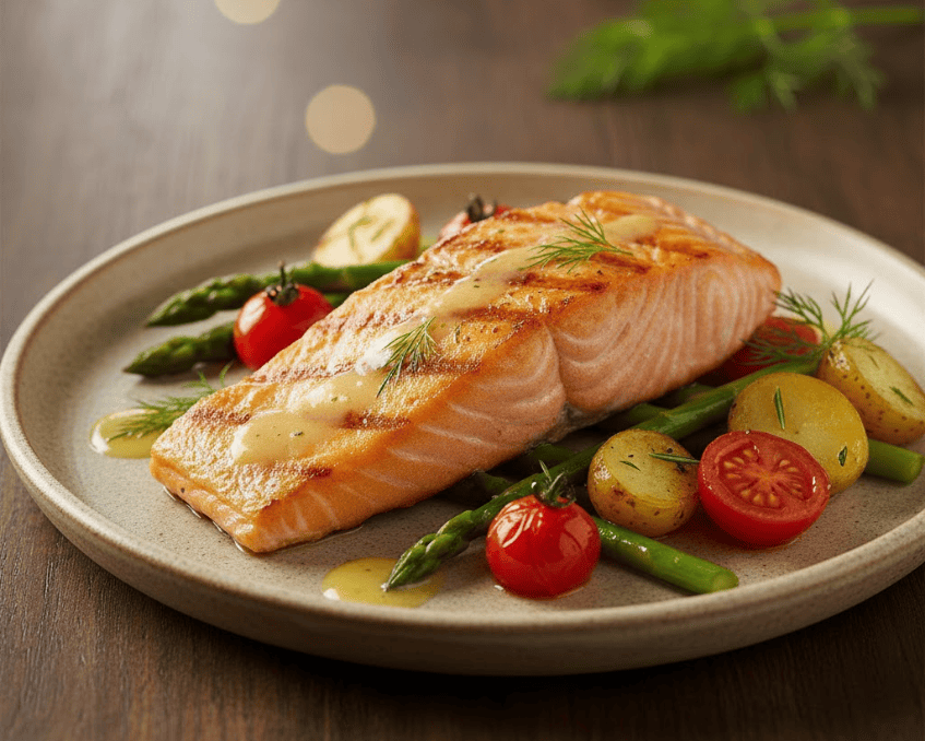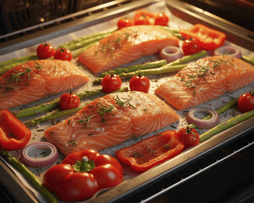 - Cách chế biến: Nướng cá hồi cùng rau củ và gia vị ở nhiệt độ cao để giữ trọn độ ẩm.