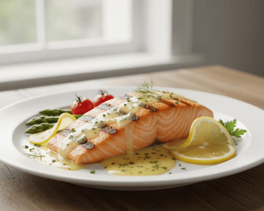 Đặt cá hồi nướng ra đĩa, xếp rau củ xung quanh, rưới nước sốt bơ chanh lên mặt cá. Ăn nóng kèm cơm trắng hoặc bánh mì nướng đều rất ngon.