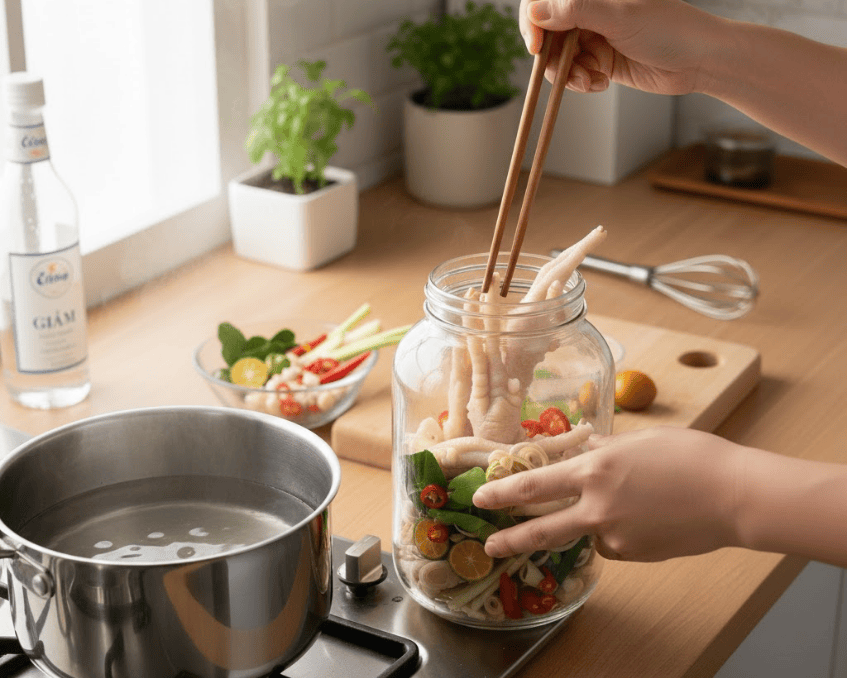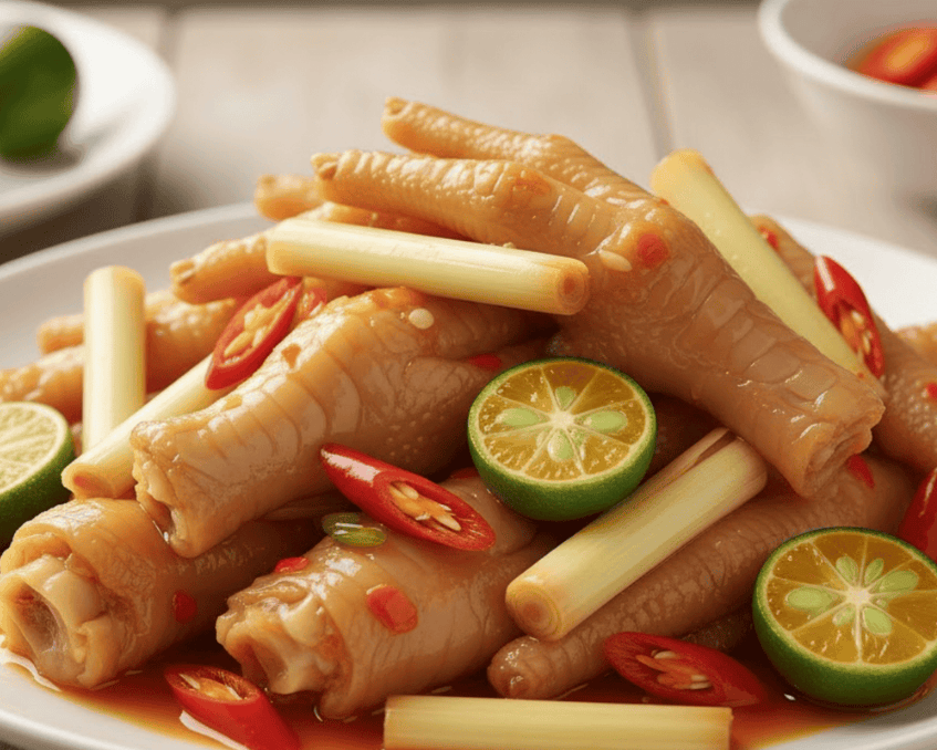 - Cách trình bày và thưởng thức: Chân gà được bày ra tô hoặc dĩa, rưới thêm nước ngâm, thêm lát tắc, sả và vài miếng ớt để tăng màu sắc. Món này ăn ngon nhất khi để lạnh.