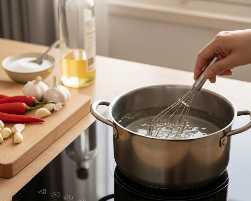 - Cho 200 ml nước + 120 ml giấm + 80–100 g đường + 1 muỗng cà phê muối vào nồi.