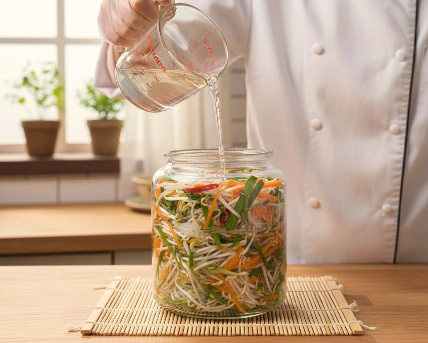 - Giấm – đường – muối: Dùng giấm gạo (hoặc giấm nuôi) cho vị chua dịu, không gắt. Đường giúp vị dưa tròn và dễ ăn; thêm muối vừa đủ giúp dưa đậm đà và giòn lâu hơn.