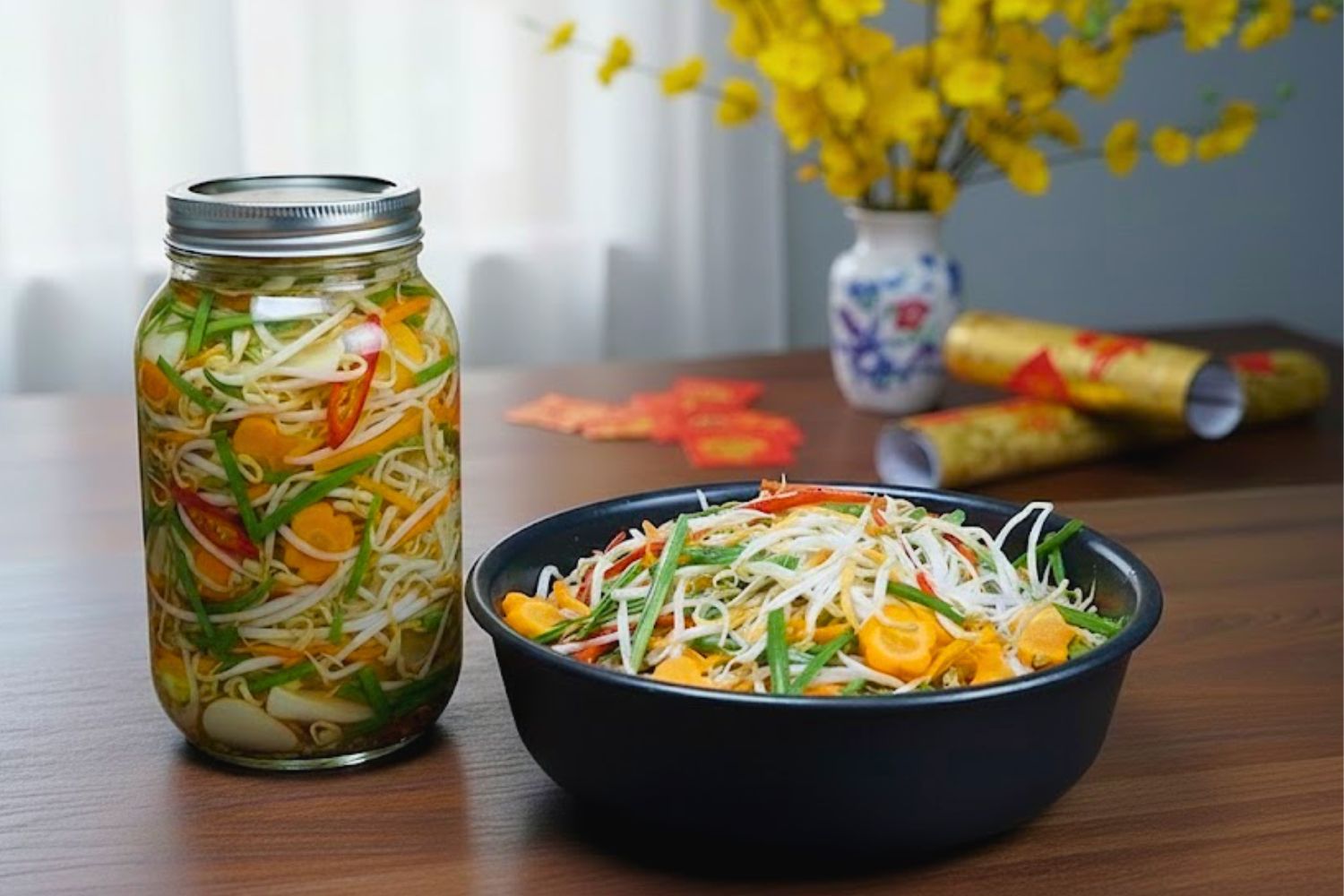 - Hương vị: Chua ngọt dịu, thơm mùi hẹ, giá giòn mát, cà rốt ngọt nhẹ và tạo màu bắt mắt.
