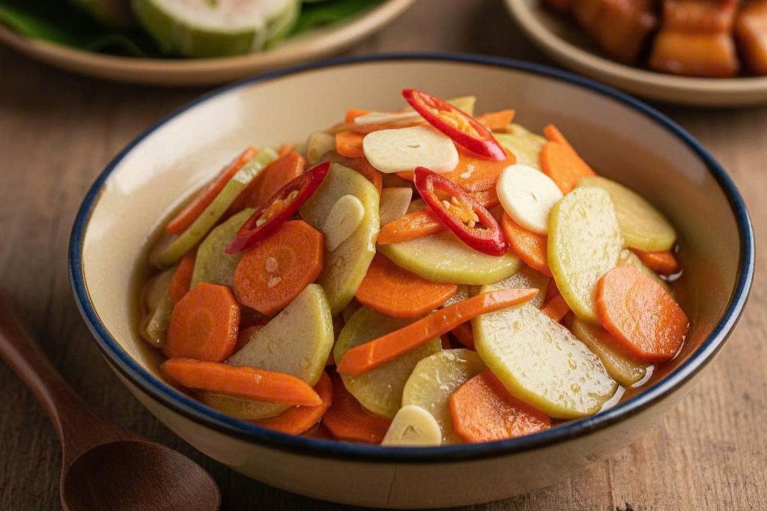 • Hương vị: Mặn ngọt hài hòa, thơm mùi nước mắm đường, điểm vị cay nhẹ của ớt và mùi tỏi. Củ quả giòn, không mềm nhũn.