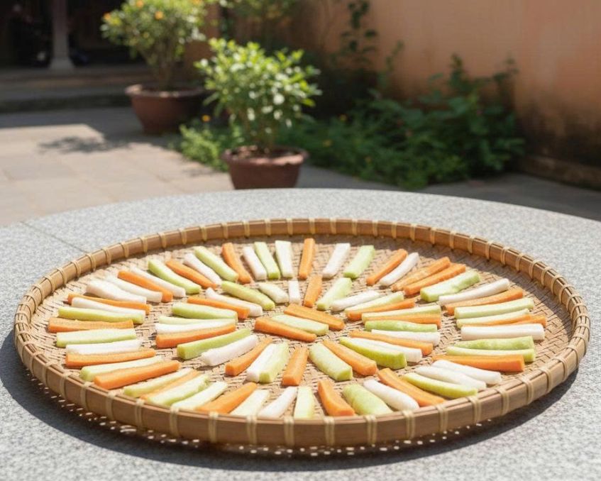 • Trải củ quả ra nia/khay, phơi nắng 1–2 ngày đến khi se mặt, héo nhẹ, cầm không còn ướt nhưng vẫn còn độ dẻo giòn.