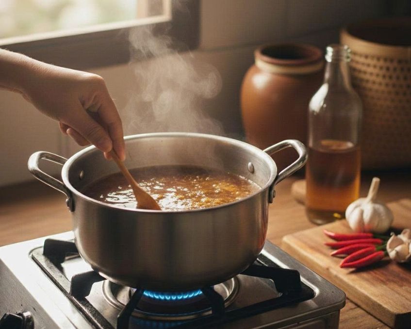 • Đun lửa vừa 85–95°C, khuấy cho đường tan hoàn toàn, tắt bếp.