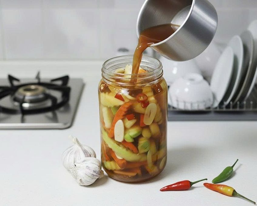 Lưu ý: Để dưa món được ngon và bảo quản lâu hơn, đảm bảo hũ thủy tinh đã được vệ sinh sạch bằng cách rửa qua nước và trụng sơ qua nước sôi, sau đó để thật ráo.