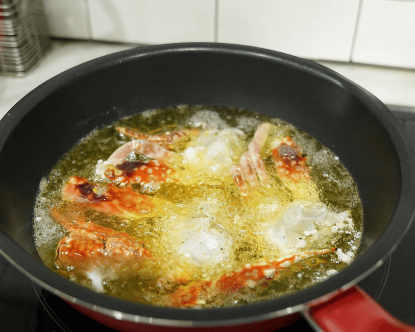 - Bắc chảo dầu lên bếp, đun nóng. Có thể lăn nhẹ phần mặt cắt của ghẹ qua một lớp bột năng mỏng.