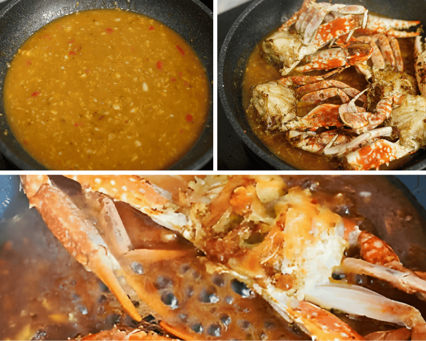 - Trút toàn bộ ghẹ đã chiên vào chảo sốt. Đảo đều tay ở lửa vừa khoảng 5-7 phút cho ghẹ thấm đẫm nước sốt. Cho hành tây vào đảo thêm 1 phút rồi tắt bếp.
