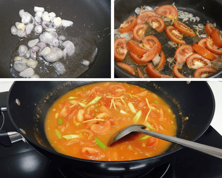 - Cho cà chua thái nhỏ vào, nêm muối, hạt nêm, đường, đảo đều.