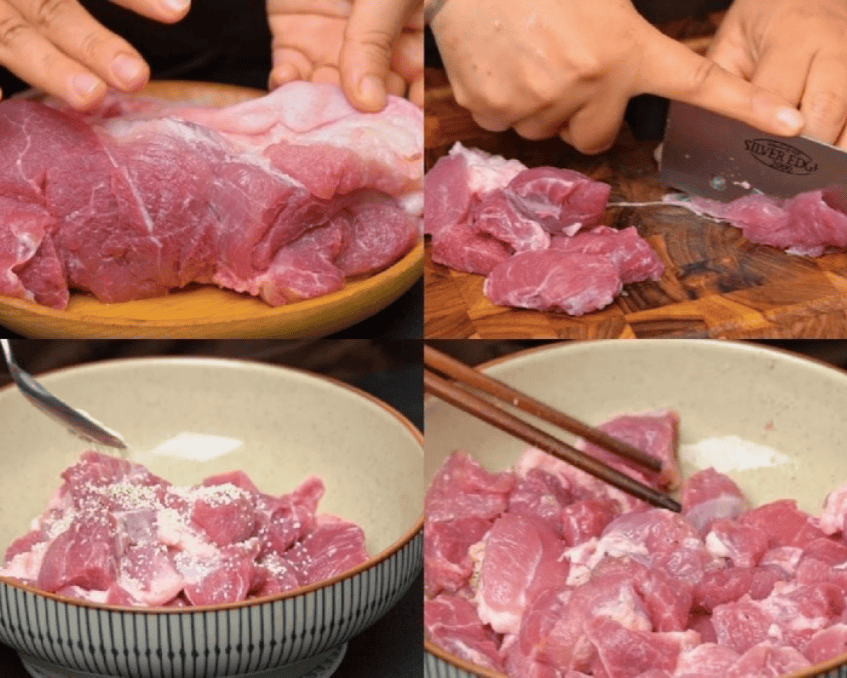 - Rửa sạch thịt đùi heo, chần sơ qua nước sôi 2 phút để loại bỏ bọt bẩn.