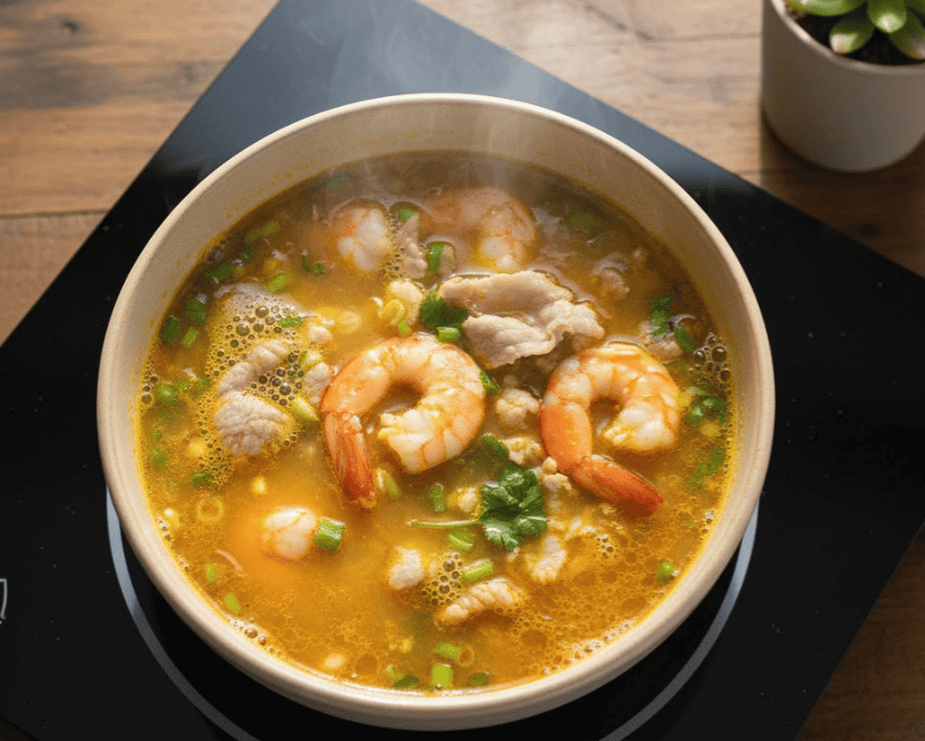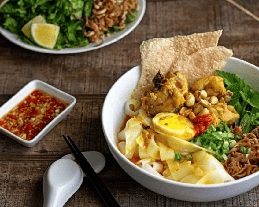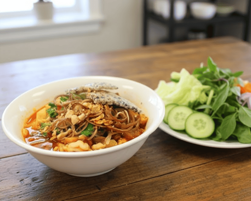 - Hương vị: Vị ngọt thanh tự nhiên từ nước dùng ninh xương, kết hợp vị tôm tươi và thịt đùi heo. Hương thơm từ nghệ, hành phi và gia vị tạo nên nét đặc trưng riêng.