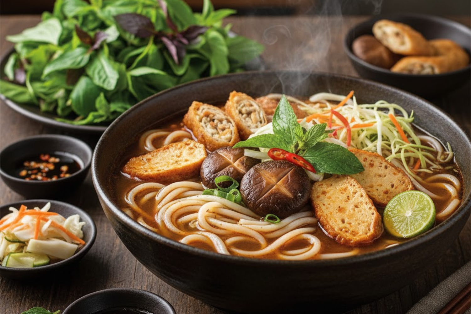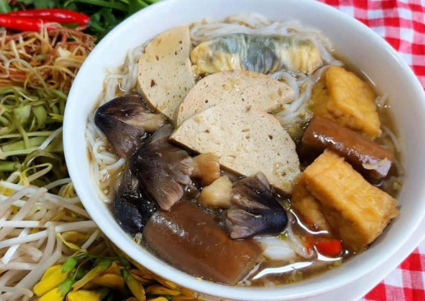 - Cách chế biến: Nấu nước dùng từ mắm chay, củ cải, thơm và nấm; ăn kèm bún tươi, rau sống và topping đậu hũ.