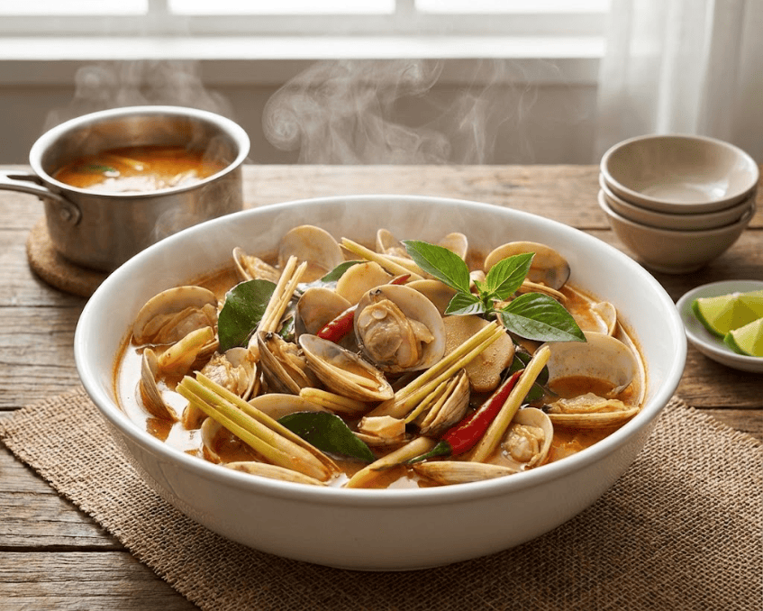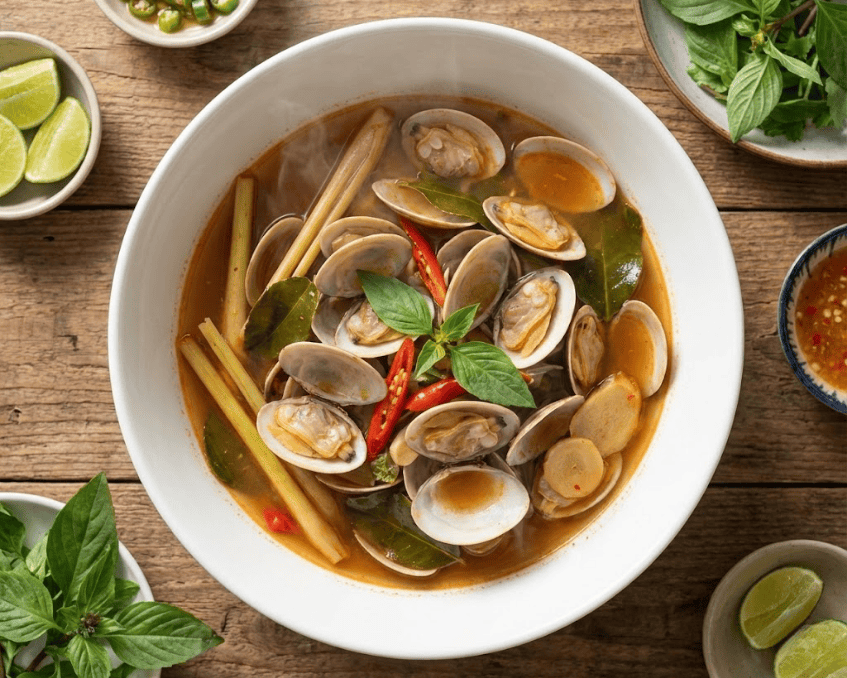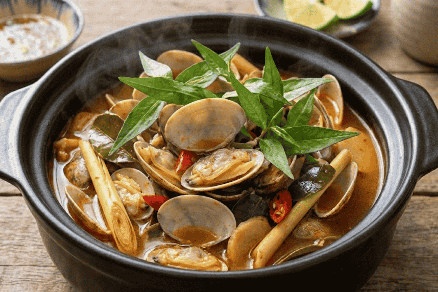 - Hương vị: Sự cân bằng tuyệt đối giữa 4 vị: Chua (từ me) – Cay (từ ớt và sa tế) – Mặn (từ nước mắm) – Ngọt (từ đường và thịt nghêu). Nước dùng đậm đà, thơm lừng hương thảo mộc.