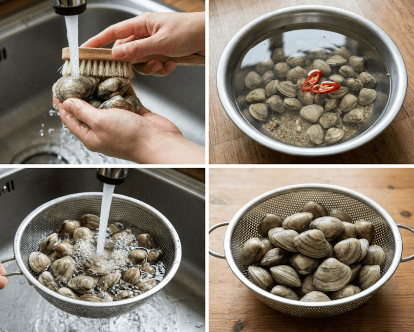 - Ngâm nghêu trong thau nước sạch, cắt vào 2 quả ớt hiểm trong 30 phút để nghêu nhả sạch cát và bùn đất.