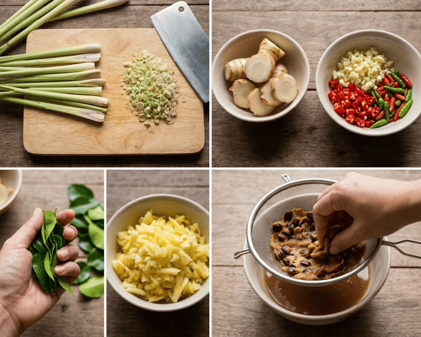 - Sả cây: Một nửa đập dập cắt khúc, một nửa băm nhỏ.