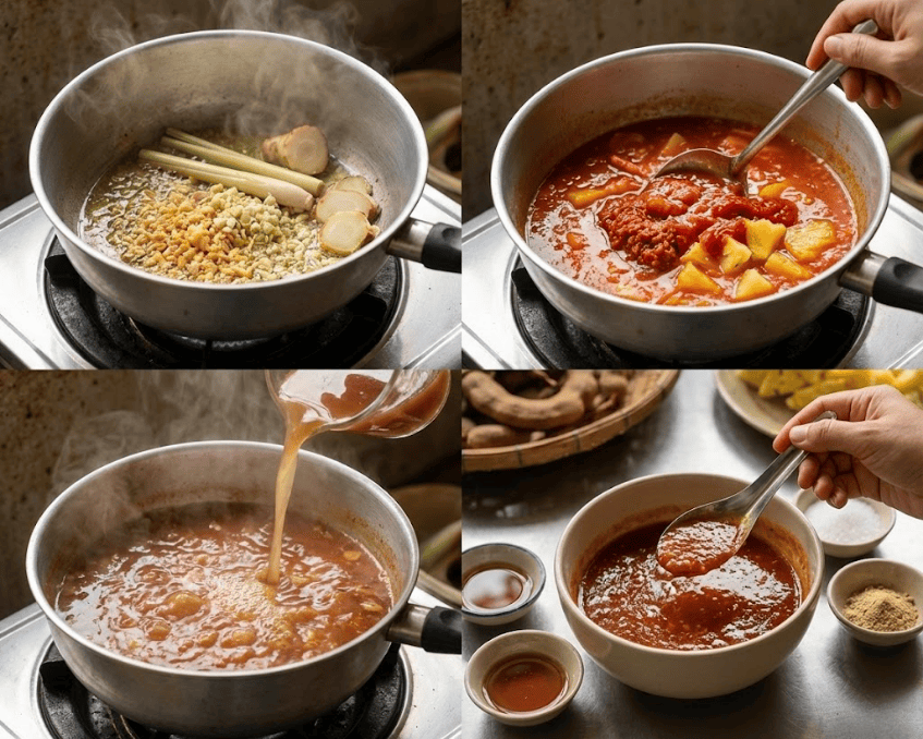 - Đổ 400 ml nước lọc còn lại và nước cốt me vào nồi. Đun sôi.