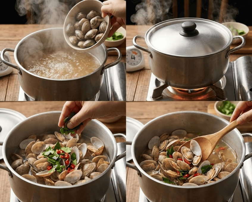 - Tắt bếp ngay khi tất cả nghêu vừa há miệng hoàn toàn (không nấu lâu để tránh thịt nghêu bị dai).