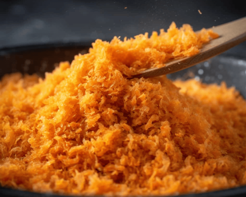 - Cách chế biến: Cá hồi được hấp chín, tách nhỏ và sao khô nhẹ trên chảo cho đến khi sợi ruốc tơi vàng.