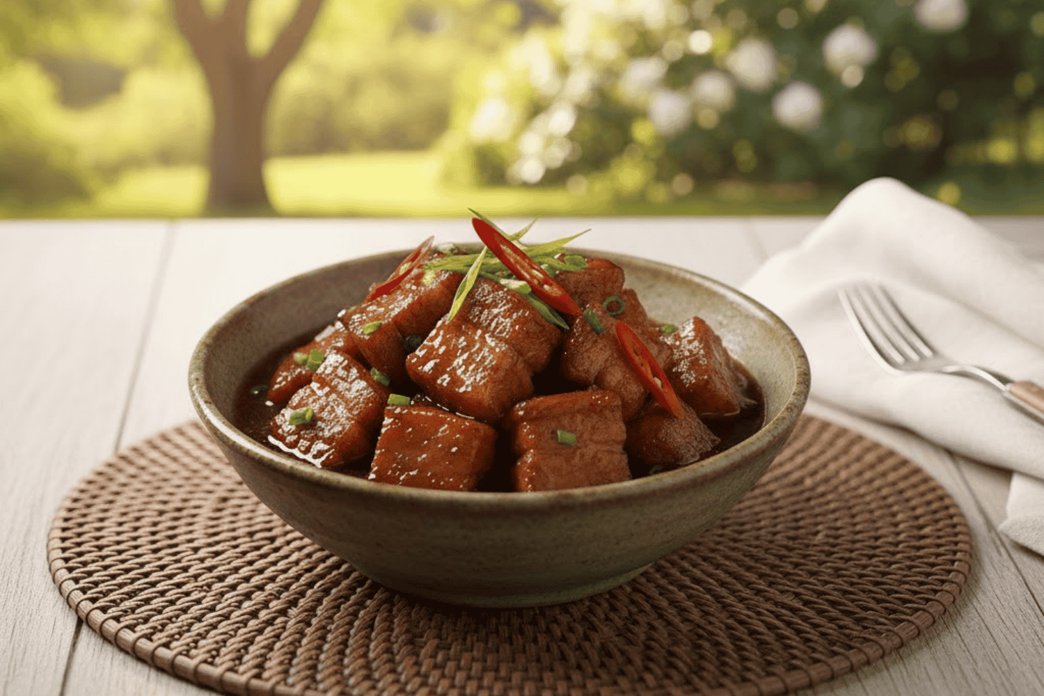 - Đun sôi, sau đó hạ lửa nhỏ và rim liu riu trong khoảng 30–40 phút cho đến khi nước sốt cạn, sánh lại và thịt mềm, có màu cánh gián đẹp mắt.