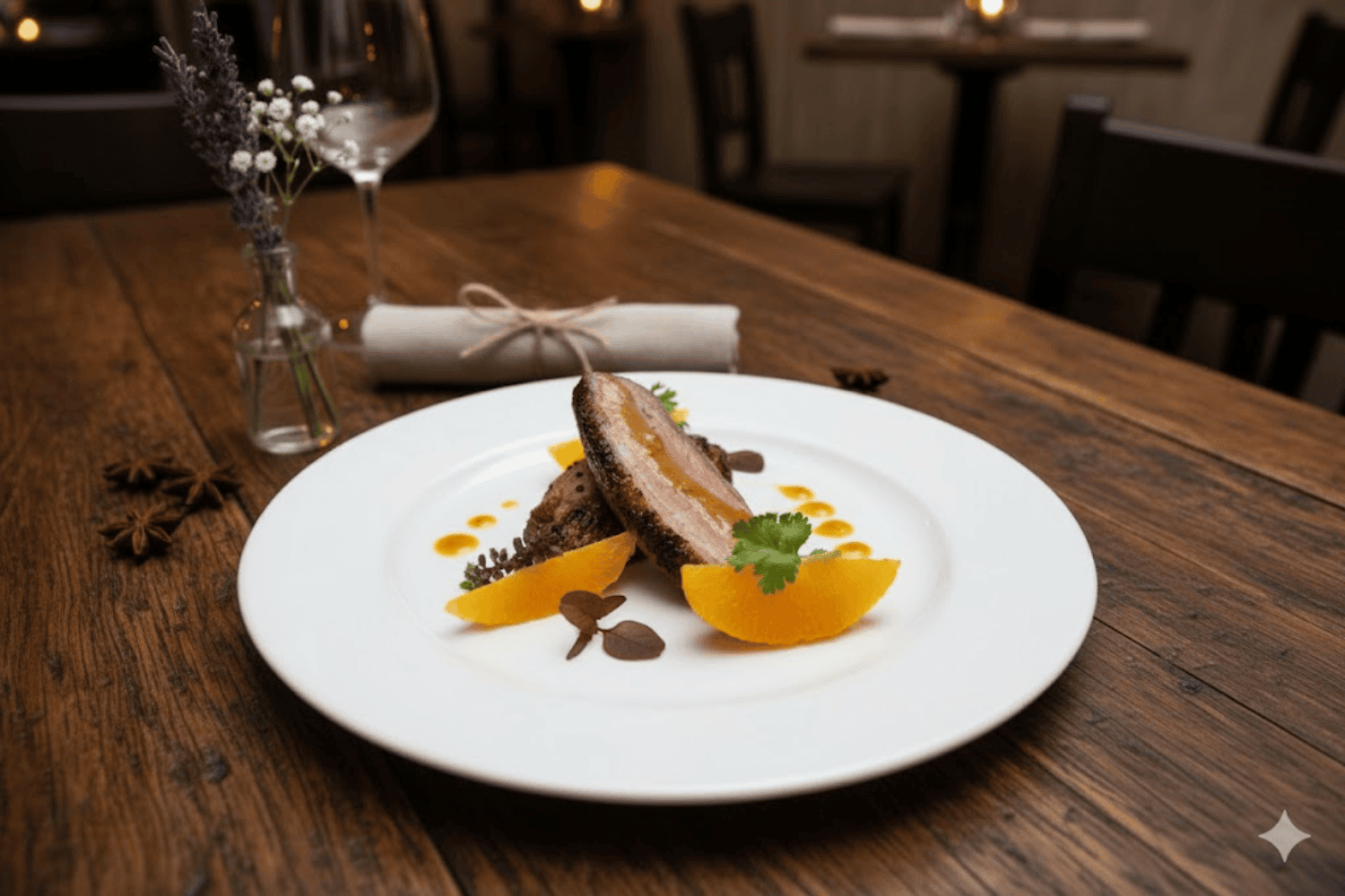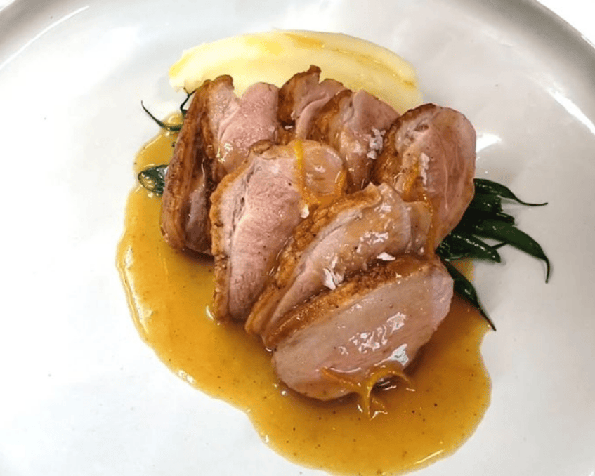 • Cách trình bày: Thịt vịt được cắt lát xếp nghiêng, rưới sốt cam lên phần thịt, ăn kèm khoai tây nghiền hoặc rau củ áp chảo.