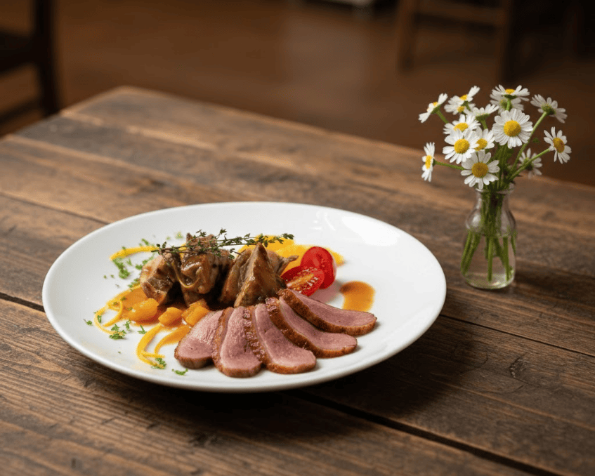 Ức vịt áp chảo sốt cam là món ăn nổi bật trong ẩm thực Âu, được yêu thích nhờ lớp da giòn vàng, phần thịt hồng mềm mọng nước cùng hương vị nước sốt cam đậm đà, chua ngọt hài hòa. Khi áp chảo đúng kỹ thuật, mỡ vịt được rút ra giúp phần da giòn rụm, không hề ngấy. Món ăn phù hợp cho bữa tối sang trọng hoặc những dịp cần thực đơn tinh tế, đẹp mắt.