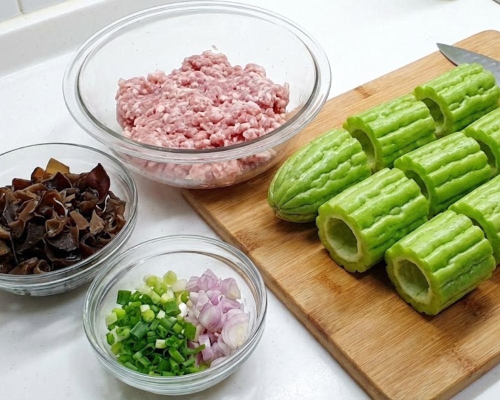 - Khổ qua rửa sạch, cắt khúc 4–5 cm, bỏ ruột.